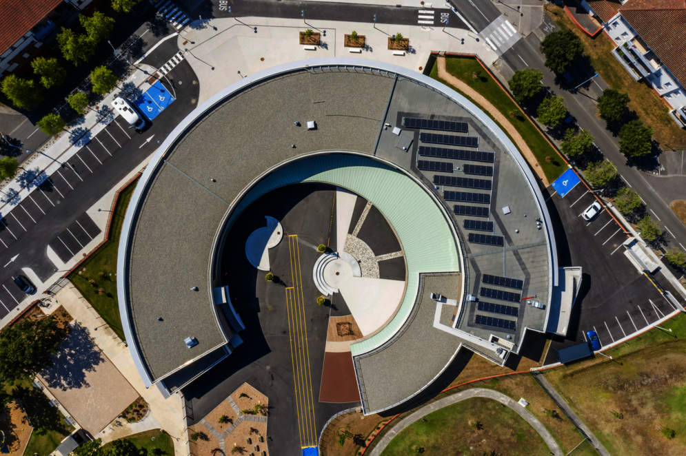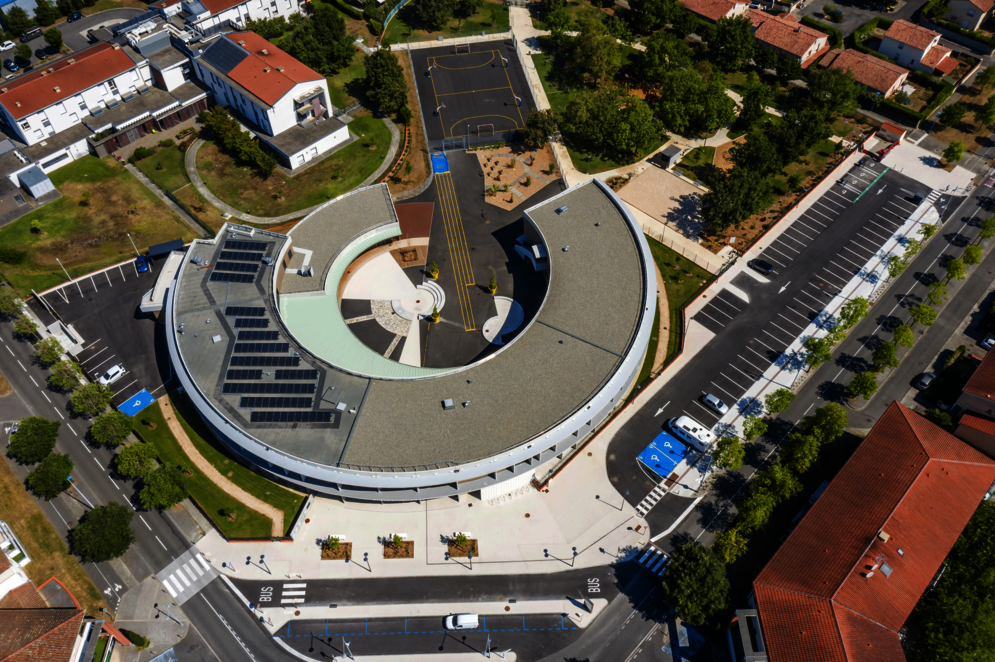 L’école Simone-Veil s’affirme comme élément clef de la structuration du quartier excentré des Marots et de l’offre scolaire communale. L’opération associe Harter Architectes Associés et l’agence AFA. Une composition en demi-cercle, simple, compacte mais assortie d’une surface vitrée très généreuse, marque la relation intime de l’équipement public à son environnement immédiat – place publique, parc arboré existants; terrain de sport partagé avec les habitants. La structure béton/bois se déploie de manière à maîtriser l’ensoleillement, apporter le meilleur confort intérieur, générer une perception chaleureuse. La performance énergétique atteint le niveau RT 2020. Un atelier participatif d’artistes a été associé au projet, lequel rend hommage (facture des sols) à Sonia Delaunay, importante créatrice française du XXe siècle dans les domaines de la peinture, des arts graphiques et de la mode.